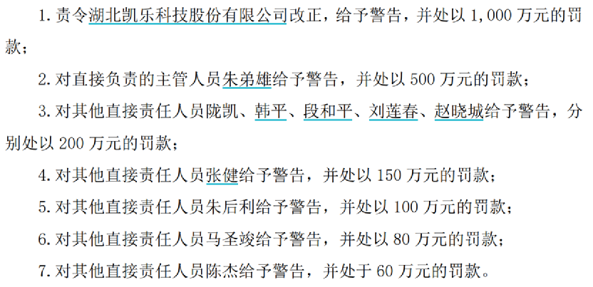 对于公司董事长朱弟雄,告知书中表示,其对*ST凯乐的生产经营拥有实际控制权,决策、组织实施财务造假,授意、指挥*ST凯乐开展虚假业务,手段特别恶劣,情节特别严重,是*ST凯乐信息披露违法行为直接负责的主管人员。对其施以500万元罚款,并对其采取终身市场禁入措施。