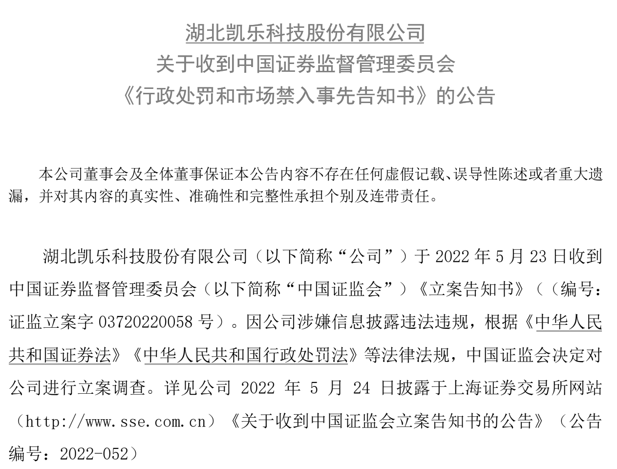 此外,证监会认定*ST凯乐的上述行为涉嫌违反《中华人民共和国证券法》相关规定,拟对*ST凯乐及相关责任人作出罚款等行政处罚及市场禁入措施。