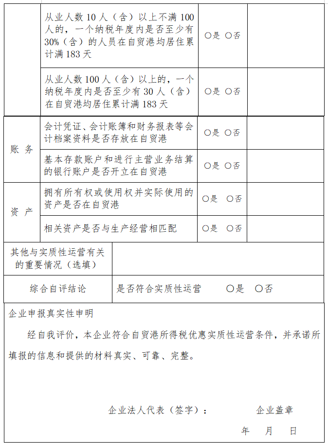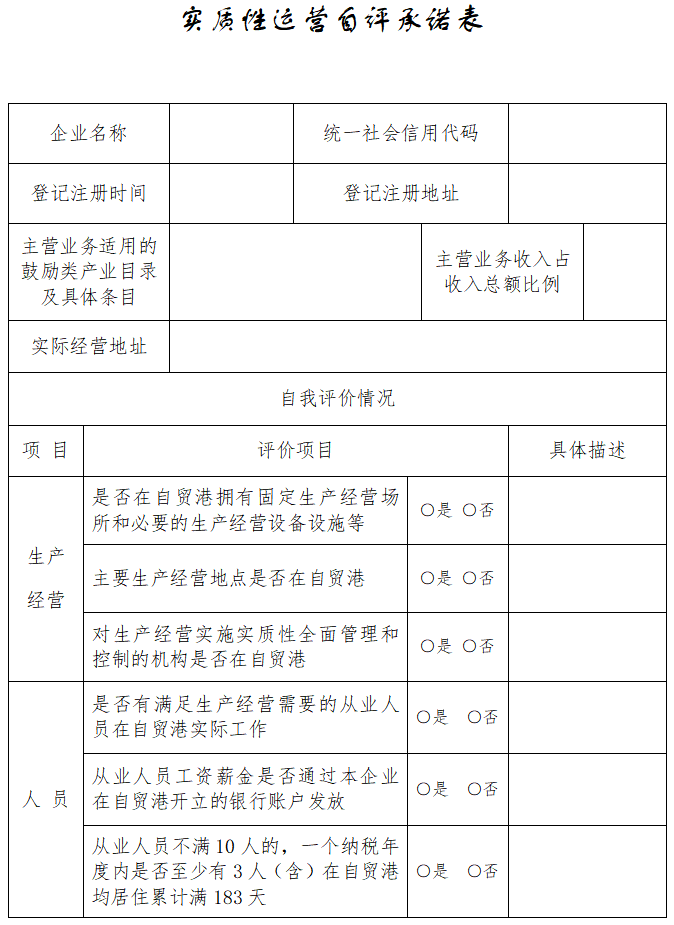 享受自贸港鼓励类产业企业所得税优惠政策的企业,采取“自行判定、申报承诺、相关资料留存备查”的申报办理方式。企业在进行所得税年度汇算清缴申报时,填写《实质性运营自评承诺表》(附件),与纳税申报表一并通过电子税务局提交。
