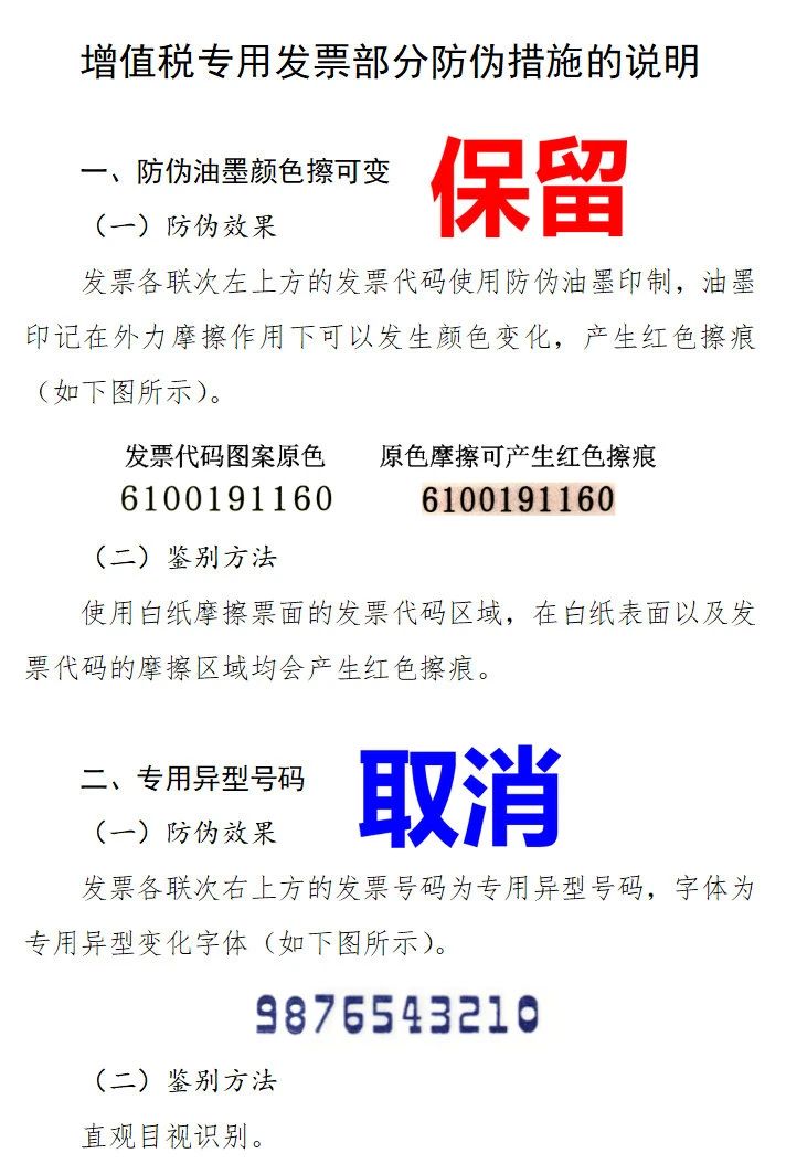 取消专用异型号码、复合信息防伪等防伪措施,继续保留防伪油墨颜色擦可变等防伪措施。防伪油墨颜色擦可变的防伪效果和鉴别方法见《国家税务总局关于调整增值税专用发票防伪措施有关事项的公告》(2019年第9号)附件。