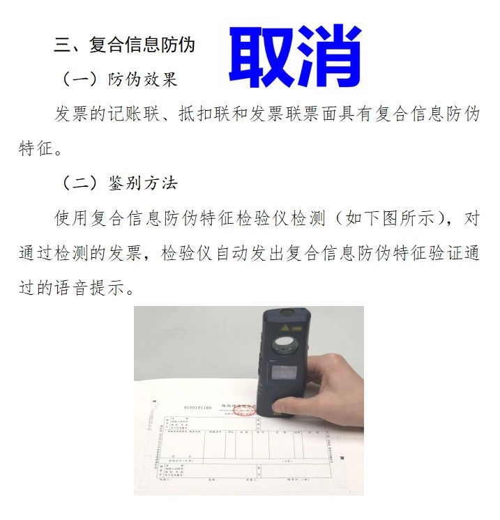 《国家税务总局关于调整增值税专用发票防伪措施有关事项的公告》(2019年第9号)公布了防伪油墨颜色擦可变、专用异型号码、复合信息防伪等防伪措施。在此基础上,此次取消了专用异型号码、复合信息防伪等防伪措施。