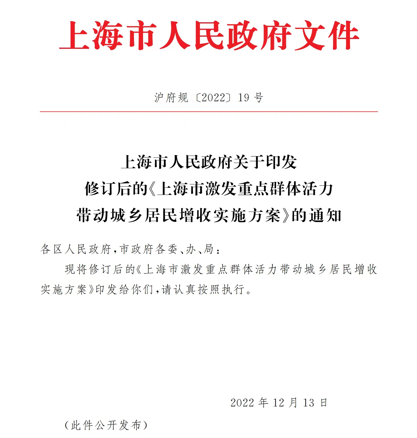 近日,上海市人民政府发布关于印发修订后的《上海市激发重点群体活力带动城乡居民增收实施方案》的通知,《方案》自2022年12月14日起施行,有效期至2025年12月13日。