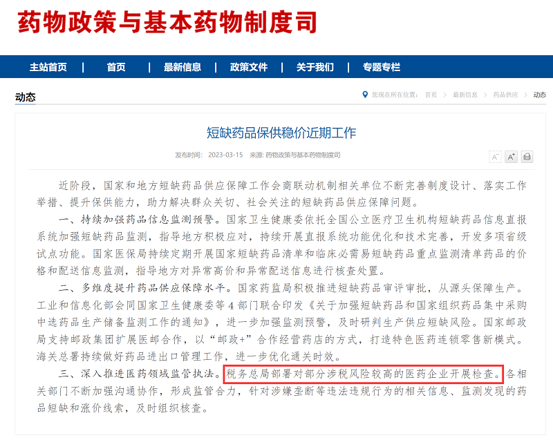 近日,卫健委药物政策与基本药物制度司开展短缺药品保供稳价近期工作。要求深入推进医药领域监管执法。税务总局部署对部分涉税风险较高的医药企业开展检查。各相关部门不断加强沟通协作,形成监管合力,针对涉嫌垄断等违法违规行为的相关信息、监测发现的药品短缺和涨价线索,及时组织核查。