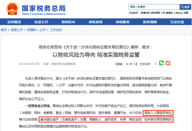 2021年3月,中共中央办公厅、国务院办公厅印发了《关于进一步深化税收征管改革的意见》,国家税务总局为贯彻落实该意见,明确要依法加强对高收入高净值人员的税费服务与监管。