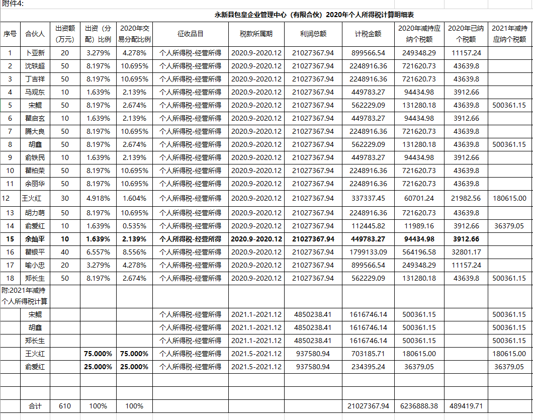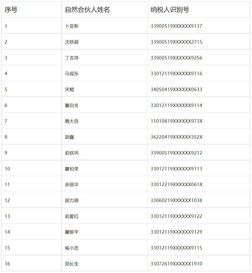 永新县包皇企业管理中心(有限合伙)(纳税人识别号91330206MA282P5L00)并卜亚新等16个有限合伙人: