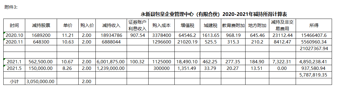 包皇2020年11月减持64.83万股,增值税应税收入为2102018.81元,2020年12月2日申报销售金额3304894.07元,申报缴纳增值税33048.94元。