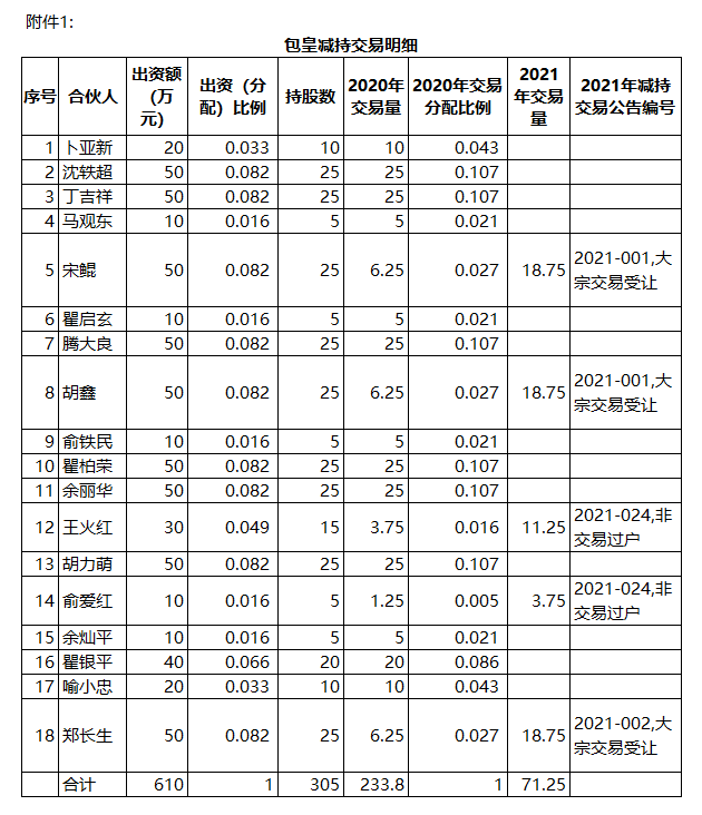 包皇2021年1月大宗交易减持56.25万股,增值税应税收入为1849009.90元,2021年1月8日零申报。