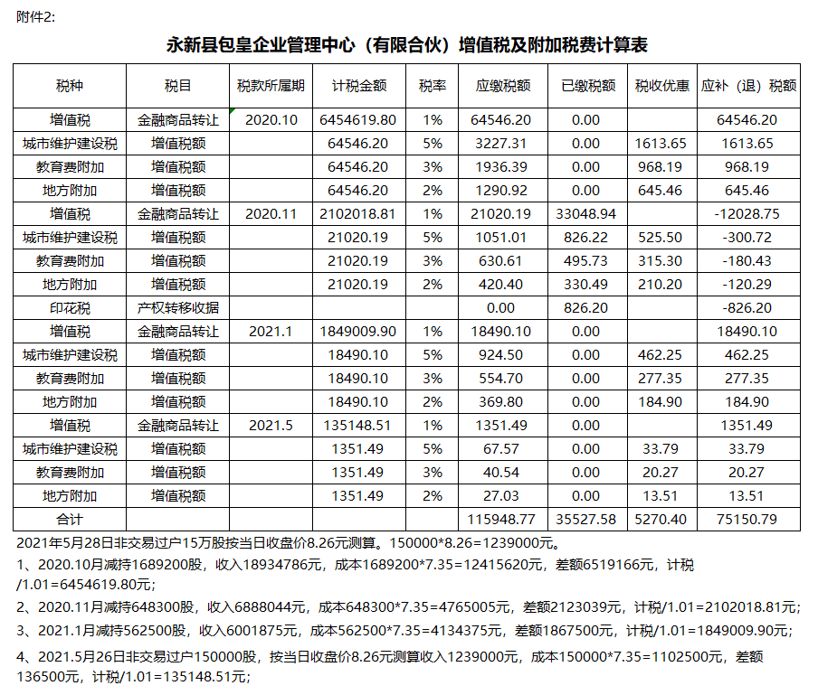 包皇2021年5月非交易过户减持15万股,增值税应税收入为135148.51元,2021年5月未申报。