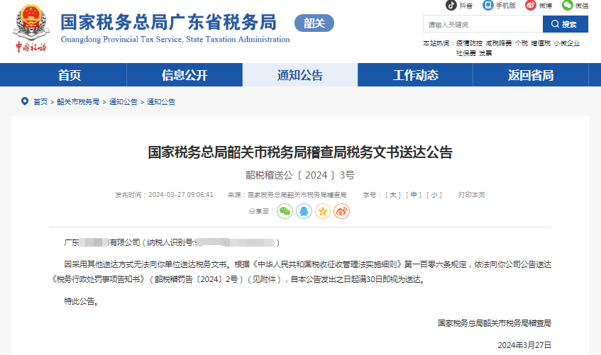 我局于2021年6月8日对你公司税收违法行为作出《税务行政处罚决定书》(韶税稽罚〔2021〕2号),对你公司少缴营业税、城市维护建设税、土地增值税、印花税认定为距税务机关发现违法期限已超过五年,未进行处罚。现根据审计署驻广州特派办对你公司偷税案件审计意见、《全国人大常委会法制工作委员会关于提请明确对行政处罚追诉时效“二年未被发现”认定问题的函的研究意见》(法工委复字〔2004〕27号)及《税务稽查案件办理程序规定》,对你公司的税收违法行为拟于2024年3月7日之前重新作出行政处罚决定,根据《中华人民共和国税收征收管理法》第八条、《中华人民共和国行政处罚法》第四十四条、第六十三条、第六十四条规定,现将有关事项告知如下: