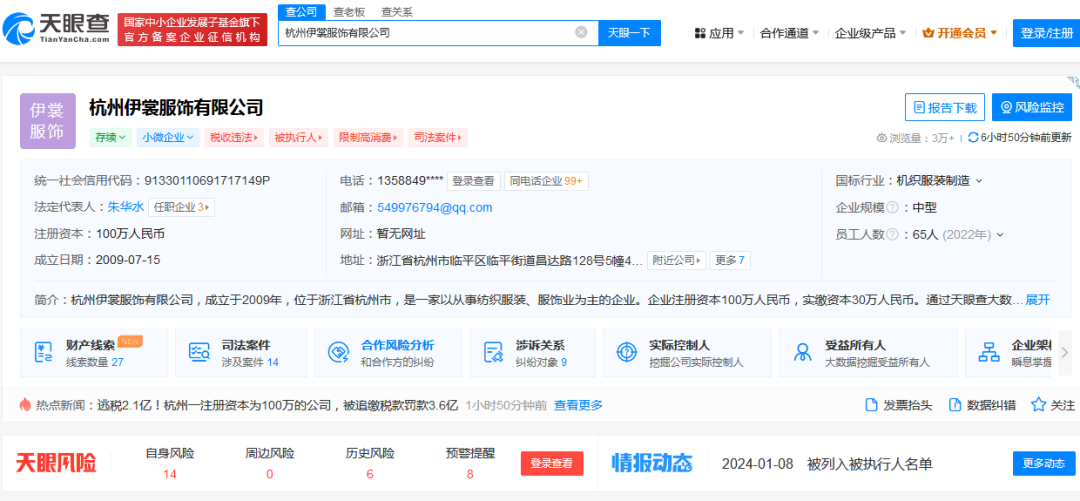 经国家税务总局杭州市税务局第三稽查局检查,发现该公司在2014年01月至2021年06月期间,主要存在以下问题:采取逃避缴纳税款手段,不缴或者少缴应纳税款21237.93万元。根据相关规定,该公司被处以追缴税款21390.99万元的行政处理、处以罚款14866.55万元的行政处罚,共计3.6亿元。天眼查显示,杭州伊裳服饰有限公司,成立于2009年,位于浙江省杭州市,是一家以从事纺织服装、服饰业为主的企业。
