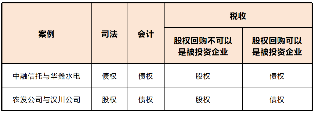 二、民商法实践案例 (一)认定为负债 ★中融信托以增资27亿元名义取得华鑫水电5%股权,派驻一名董事,对重大事项享有一票否决权;黄河再生铝按照增资款+回购溢价(固定溢价率13.3%/年)回购股权,华鑫水电向中融信托支付利息。 ★华鑫水电进入破产程序,中融信托与管理人关于投资款是债权还是股权存在争议。法院认为,华鑫水电通过中融信托达到了融资目的,中融信托保证资金投入并获取收益款,实现合同约定的短期固定收益目的。从形式上看,中融信托虽持有股份,但事实上未参与华鑫水电的经营管理活动,双方在履行合作、增资、股权转让协议期间并没有将中融信托作为股东对待,最后认定为名股实债。 (二)认定为股权 农发公司增资1.87亿元取得汉川公司31.86%的股权,固定年化收益率为1.2%;农发公司不直接参与汉川公司经营,但对公司章程修改等公司重大事项享有表决权;股权回购条件成就时,农发公司有权要求通联公司或政府回购所持股权。 2017年10月25日,汉川公司进入破产程序,双方就“增资款”是股权款还是投资款存在争议。法院认为,农发公司取得了股东资格并享有表决权,虽然不直接参与汉川公司日常经营,但仍通过审查、审批、通知等方式在一定程度上参与管理,不能否定其股东身份;股东之间及股东与目标公司之间就投资收益和风险分担所作的内部约定,并不影响交易目的和投资模式;农发公司作为实际股东之一,其对外仍是承担相应责任和风险的;农发公司获得的固定收益仅为年1.2%,远低于一般借款利息,明显不属于通过借贷获取利息收益的情形。最后,法院认定为股权。 最高院对“名股实债”的观点为,投资人目的在于取得目标公司股权,且享有参与公司的经营管理权利的,应认定为股权投资。投资人目的是为了获取固定收益,且不享有参与公司经营管理权利的,应认定为债权投资。 三、“明股实债”财税规定 (一)“明股实债”会计规定 《企业会计准则第37号——金融工具列报》(财会[2017]14号)规定,企业不能无条件地避免以交付现金或其他金融资产来履行一项合同义务的,该合同义务符合金融负债的定义。 会计有一项重要的原则是“实质重于形式”,“明股实债”从文字意义就是形式上是投资,实质是债务,通常将其认定为负债。上述案例中融信托公司以“增资”名义取得华鑫水电公司股权、农发公司“增资”名义取得汉川公司股权,均存在到期日名明确、无条件回购或退出金额固定、退出金额与净资产公允价值无关、不承担风险和经营收益,所以根据企业会计准则应当确定为负债。 (二)“明股实债”税收规定 国家税务总局《关于企业混合性投资业务企业所得税处理问题的公告》(国税总局公告2013年第41号)第一条:企业混合性投资业务,是指兼具权益和债权双重特性的投资业务。同时符合下列条件的混合性投资业务,按本公告进行企业所得税处理: 1.被投资企业接受投资后,需要按投资合同或协议约定的利率定期支付利息(或定期支付保底利息、固定利润、固定股息); 2.有明确的投资期限或特定的投资条件,并在投资期满或者满足特定投资条件后,被投资企业需要赎回投资或偿还本金; 3.投资企业对被投资企业净资产不拥有所有权; 4.投资企业不具有选举权和被选举权; 5.投资企业不参与被投资企业日常生产经营活动。 根据(国家税务总局公告2013年第41号)关于混合型投资,即“明股实债”的条件分析,上述两个案例基本上满足第一、三、四、五项要求,但是税收认定的“明股实债”回购方是被投资企业,而案例中回购方是被投资企业的股东、控制方,从字面解释不符合税收“明股实债”条件,认定为债权存在变数。除了回购方不同之外,向被投资企业派驻董事,重大事项一票否决权可能被认为参与被投资的日常经营活动,也会影响债权的认定。 税收关于债权和股权的征管存在天壤之别,借贷行为属于增值税、企业所得税征税范围,需开具发票,而股权投资,不属于增值税征税范围,不需开具发票,分红符合条件可以免征企业所得税。 四、总结 财税领域中对“明股实债”性质的认定存在各自规定,同一案例可能出现与民商法不同的认定。上述两个案例从司法、会计和税收的认定结果为: 税务机关应当首先尊重其他机关已经认定的民事法律关系,如果该认定与税务机关的认定存在明显抵触,在通过法定渠道解决不了的情况下,可以独立认定民事法律关系。在税收领域,由于总局出台了关于“明股实债”具体要求和处理方式,税收关于债权和股权有明确的征税方法。所以在投资前,综合多项规定对收益方式、经营管理、回购方式等作出明确约定,可以考虑在投资协议中明确“明股实债”、“债权投资”,避免后续不必要的麻烦。