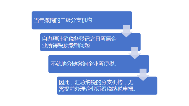 (四)当年撤销的二级分支机构,自办理注销税务登记之日所属企业所得税预缴期间起,不就地分摊缴纳企业所得税。