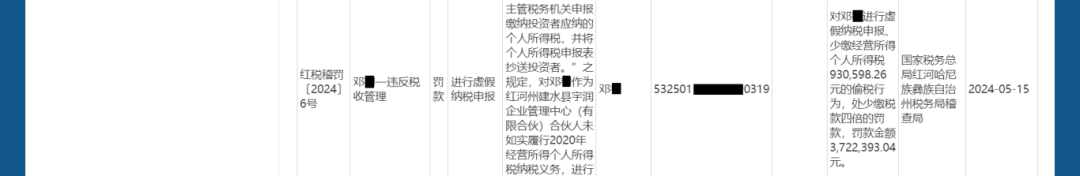 2024年5月15日,国家税务总局红河哈尼族彝族自治州税务局稽查局公示《税务行政处罚决定书》(红税稽罚〔2024〕6号),对邓某作为红河州建水县YR企业管理中心(有限合伙)合伙人未如实履行2020年经营所得个人所得税纳税义务,进行虚假纳税申报,导致少缴个人所得税930,598.26元的行为定性为偷税,处少缴税款四倍的罚款3,722,393.04元。