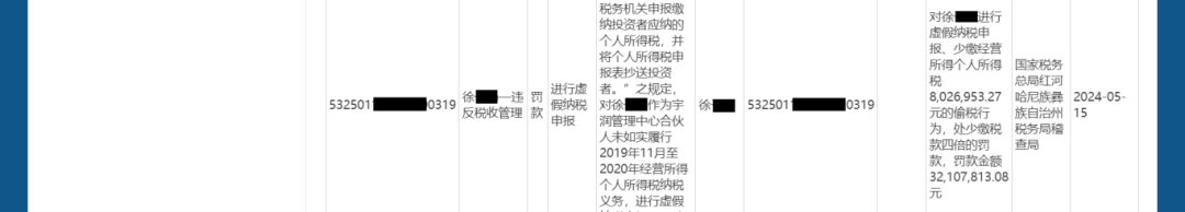 同日公示的另一份《税务行政处罚决定书》,对徐某某作为YR管理中心合伙人未如实履行2019年11月至2020年经营所得个人所得税纳税义务,进行虚假纳税申报,导致少缴个人所得税8,026,953.27元的行为定性为偷税,处少缴税款四倍的罚款32,107,813.08元。