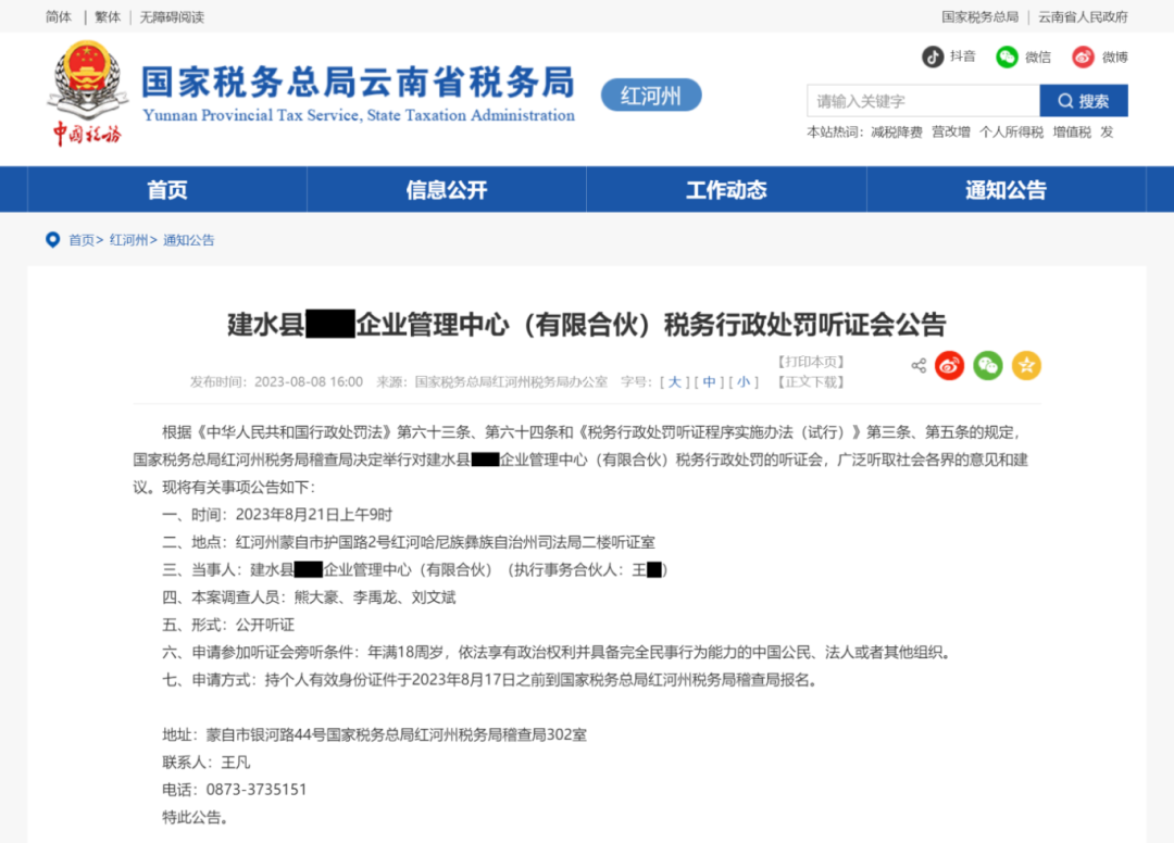 截至本文发表之日,未见对红河州建水县YR企业管理中心(有限合伙)执行合伙人邓某举行听证会的公开信息,推测可能是邓某在稽查局下达《税务行政处罚告知书》后放弃了听证权利。