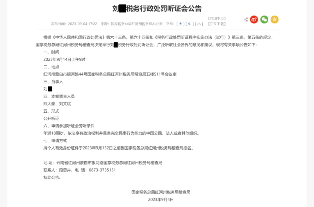 2023年9月14日上午9时,在红河州税务局稽查局五楼511号会议室对建水县XG企业管理中心(有限合伙)合伙人刘某税务行政处罚举行听证会。