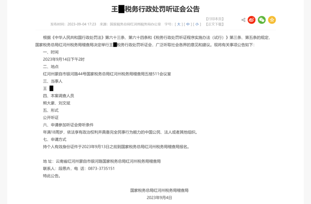 2023年9月14日下午2时,在红河州税务局稽查局五楼511号会议室对建水县XG企业管理中心(有限合伙)合伙人王某税务行政处罚举行听证会。