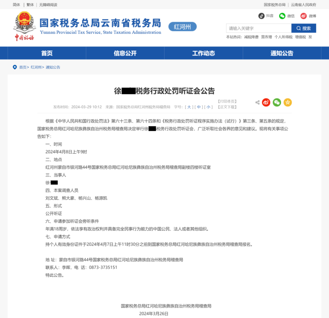 2024年4月8日上午9时,在红河州税务局稽查局副楼四楼听证室对红河州建水县YR企业管理中心(有限合伙)合伙人徐某某税务行政处罚举行听证会。