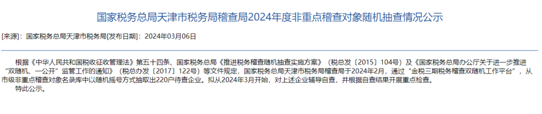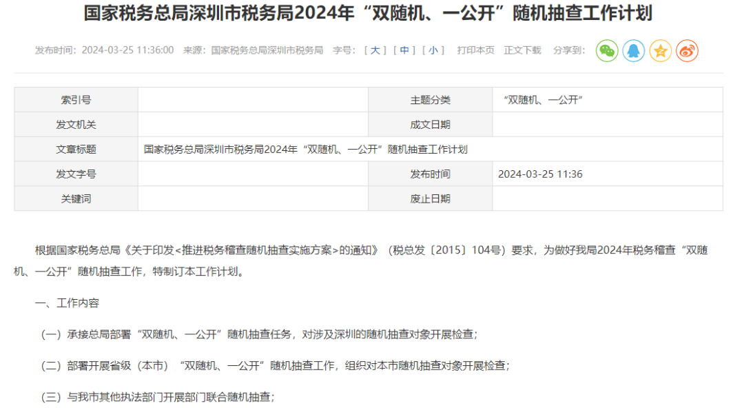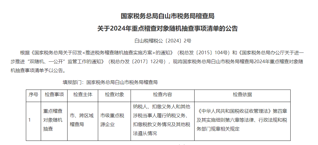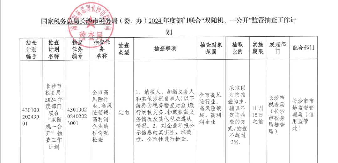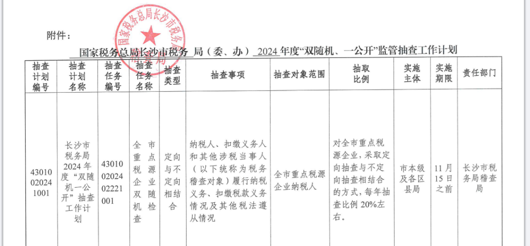 计划中显示,11月15日之前,税务局将对全市重点税源企业的纳税人、扣缴义务人和其他涉税当事人履行纳税义务、扣缴税款义务情况及其他税法遵从情况,采取定向抽查与不定向抽查相结合的方式随机抽查,每年抽查比例20%左右。