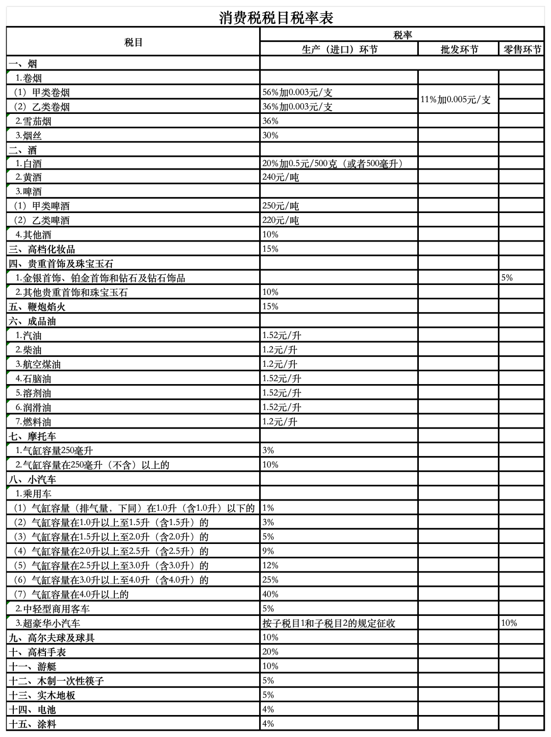 最初,消费税只针对烟、酒、成品油、小汽车等11类需要限制或调节的消费品。随着经济和环保需求的变化,电池、一次性筷子、涂料、电子烟等高污染产品也纳入征税范围。目前,消费税共有15个税目,税率范围从1%至56%不等。