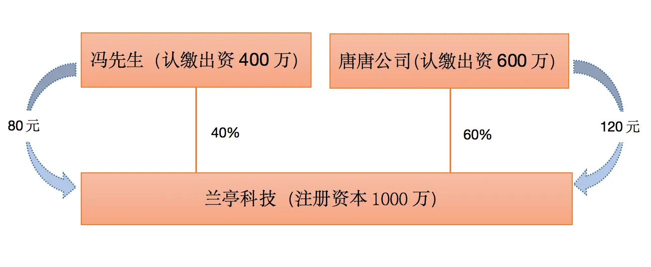 兰亭科技系由自然人股东冯先生和法人股东唐唐公司投资设立,公司注册资本1000万元,冯先生认缴出资400万元,实缴出资额为80万元,持有公司40%的股权;唐唐公司认缴出资600万元,实缴出资额为120万元,持有公司60%的股权。其股权状况如下: