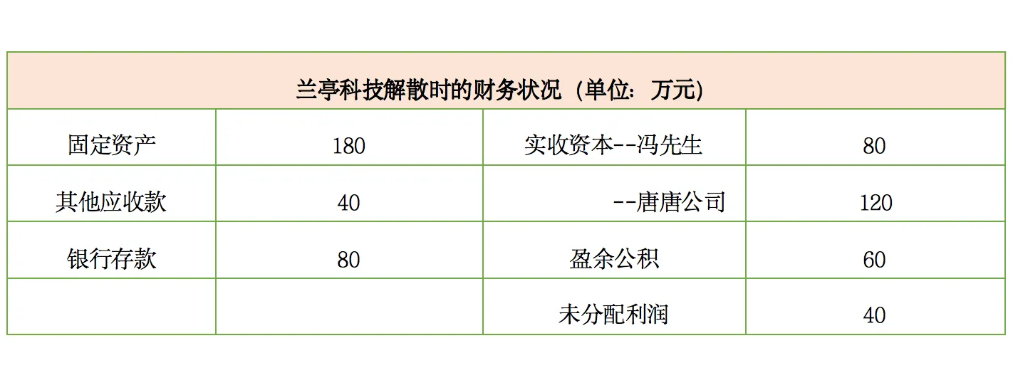 仍以兰亭科技为例,假设截至解散清算时,公司需支付员工工资6万元和社会保险2万元,法定补偿金、以前年度欠税额、企业债务均为0。