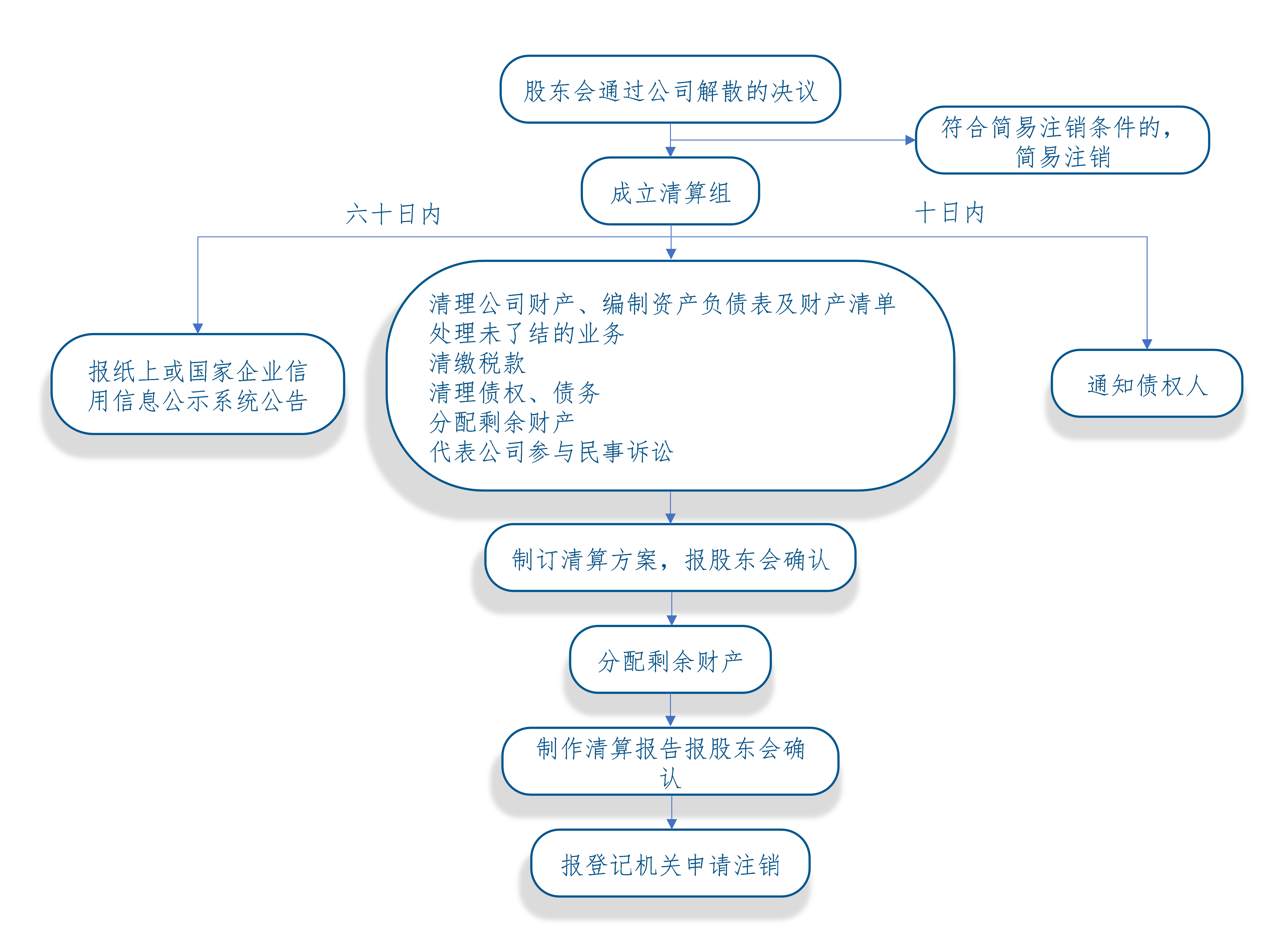 公司以股东会决议解散后正式进入解散清算的法律程序。公司进行解散清算程序后需经历成立清算组、通知、公告债权人、清理公司财产、清缴税款等法律流程。公司清算注销的基本法律流程如下: