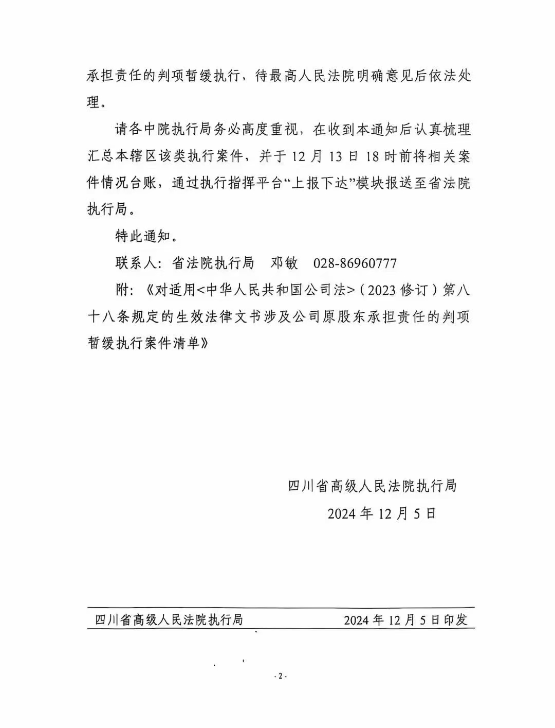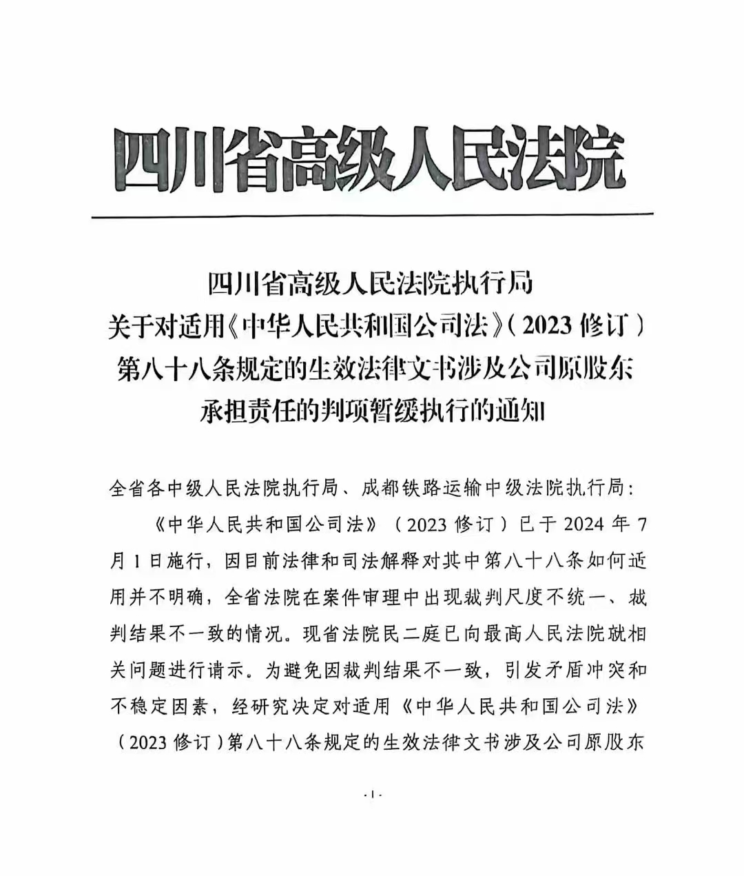 四川省高院前段时间针对这个问题发出通知,要求对相关法律文书中涉及老股东承担责任的判项暂缓执行(图片来源于网络):