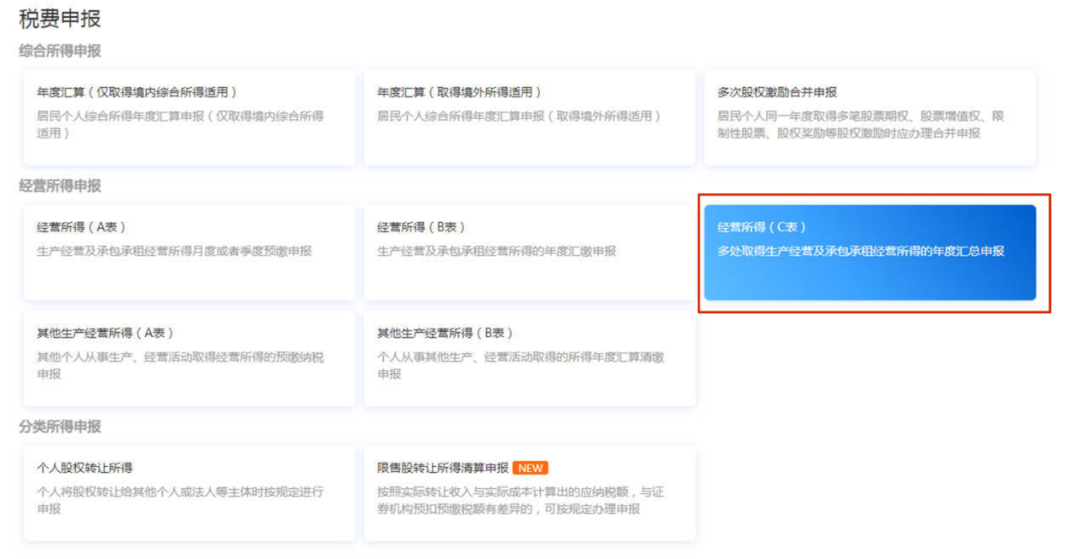 取得多处经营所得——选择向其中一处经营管理所在地主管税务机关办理年度汇总申报——填《个人所得税经营所得纳税申报表(C表)》。