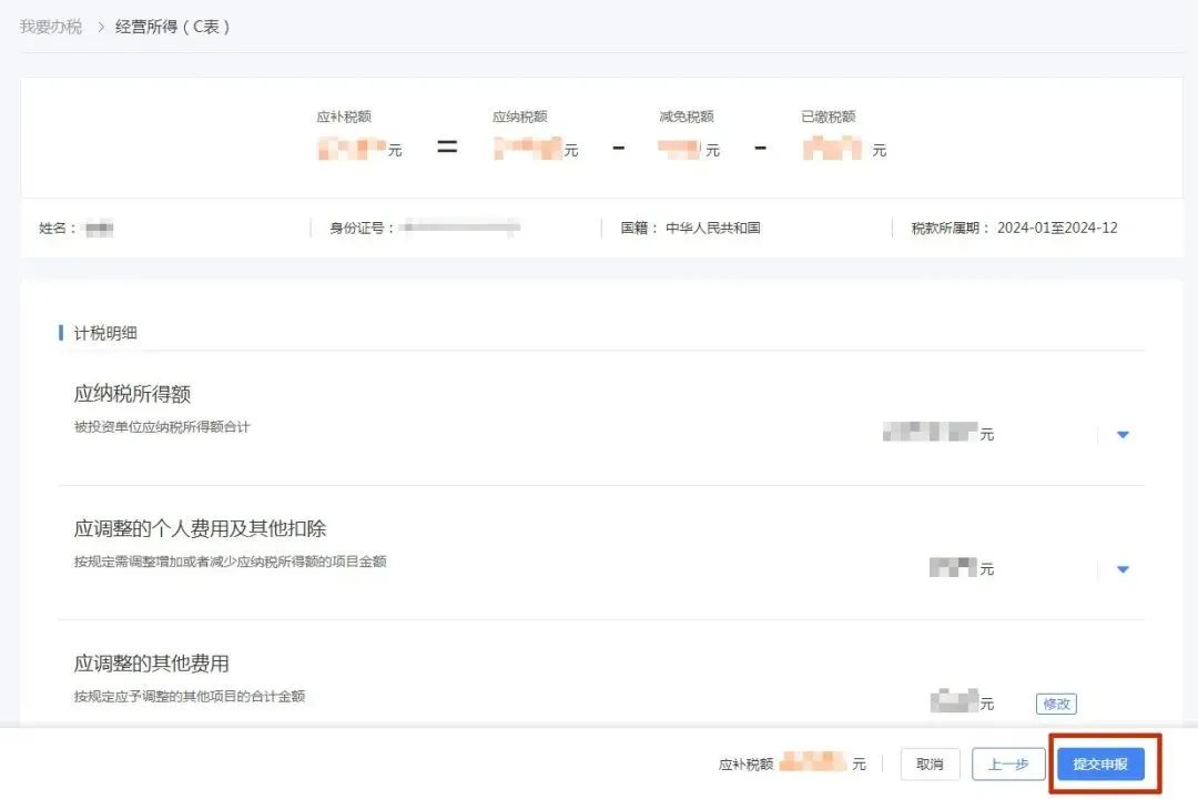 四、点击【经营所得】-【年度汇缴申报】-【修改】,根据实际情况填写收入总额成本费用、纳税调整额和弥补以前年度亏损等明细数据,填写完毕点击【确定】-【提交申报】。