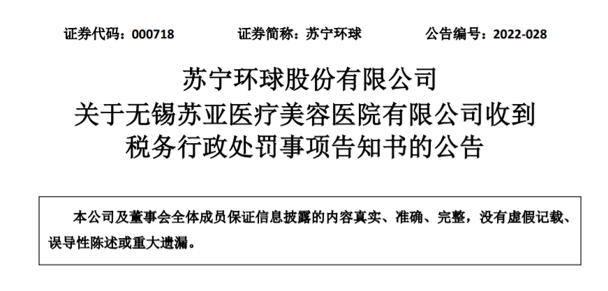 2022年8月18日,苏宁环球股份有限公司发布《关于无锡苏亚医疗美容医院有限公司收到税务行政处罚事项告知书的公告》