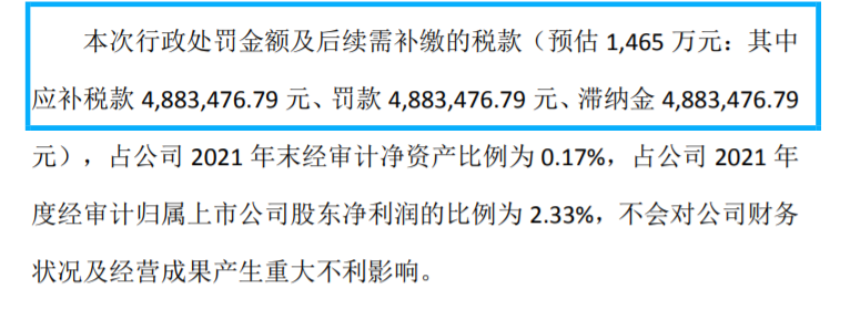 公司本次收到告知书的事项,不属于《深圳证券交易所股票上市规则》第9.5.1条、第9.5.2条、第9.5.3条规定所述的重大违法强制退市的情形,未影响公司的正常经营,不会对公司财务状况及经营成果产生重大不利影响。本次行政处罚金额及后续需补缴的税款(预估1,465万元:其中应补税款4,883,476.79元、罚款4,883,476.79元、滞纳金4,883,476.79元),占公司2021年末经审计净资产比例为0.17%,占公司2021年度经审计归属上市公司股东净利润的比例为2.33%,不会对公司财务状况及经营成果产生重大不利影响。