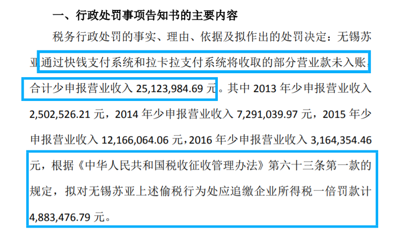无锡苏亚通过快钱支付系统和拉卡拉支付系统将收取的部分营业款未入账,合计少申报营业收入25,123,984.69元。其中: