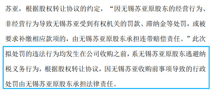 2016年7月,医美基金与无锡苏亚原股东5名自然人(以下简称“无锡苏亚原股东”)签订了《关于无锡美联臣医疗美容医院有限公司之股权转让协议》(以下简称:“股权转让协议”),收购无锡苏亚,根据股权转让协议的约定,“因无锡苏亚原股东的经营行为、非经营行为导致无锡苏亚受到有权机关的罚款、滞纳金等处罚,或被要求补缴相应款项的,由无锡苏亚原股东承担连带赔偿责任。”此次拟处罚的违法行为均发生在公司收购之前,系无锡苏亚原股东逃避纳税义务行为,根据股权转让协议,因无锡苏亚收购前事项导致的行政处罚由无锡苏亚原股东承担法律责任。