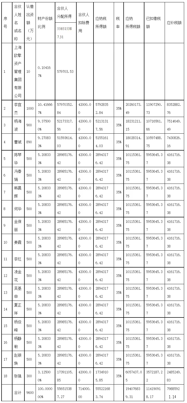 你单位2016年会计利润总额721171401.29元,扣除当年查补上述税费20704275.34元,弥补以前年度亏损4822891.81元后,你单位投资总收益695644234.14元。扣除资产管理人20%的提成后,18名合伙人(含资产管理人兼法人合伙人1名)可分配利润共计556515387.31元,其中李宜杰等17人应纳税所得额555221683.74元,应纳个人所得税194076839.31元,已代扣代缴个人所得税114190918.17元,应补个人所得税79885921.14元。其中各合伙人补税明细如下表: